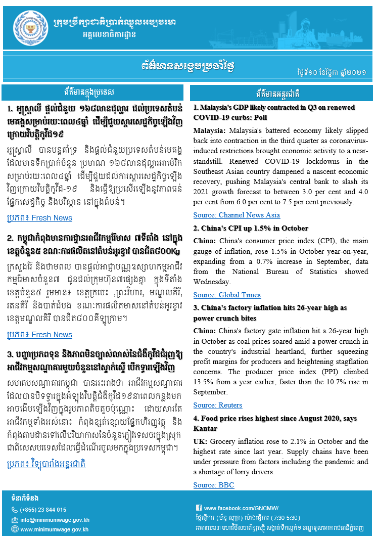 ១. អូស្រ្តាលី ផ្តល់ជំនួយ ១៦៨លានដុល្លារ ដល់ប្រទេសតំបន់មេគង្គសម្រាប់រយៈពេល៤ឆ្នាំ ដើម្បីជួយស្ដារសេដ្ឋកិច្ចឡើងវិញក្រោយវិបត្តិកូវីដ១៩