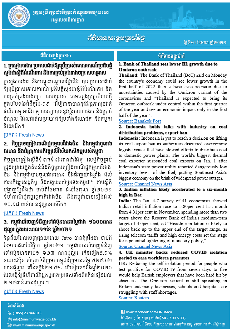 ព័ត៌មានសង្ខេបជាតិ និងអន្តរជាតិប្រចាំថ្ងៃទី៧ ខែមីនា ឆ្នាំ២០២២ ពី អគ្គលេខាធិការដ្ឋានក្រុមប្រឹក្សាជាតិប្រាក់ឈ្នួលអប្បបរមា