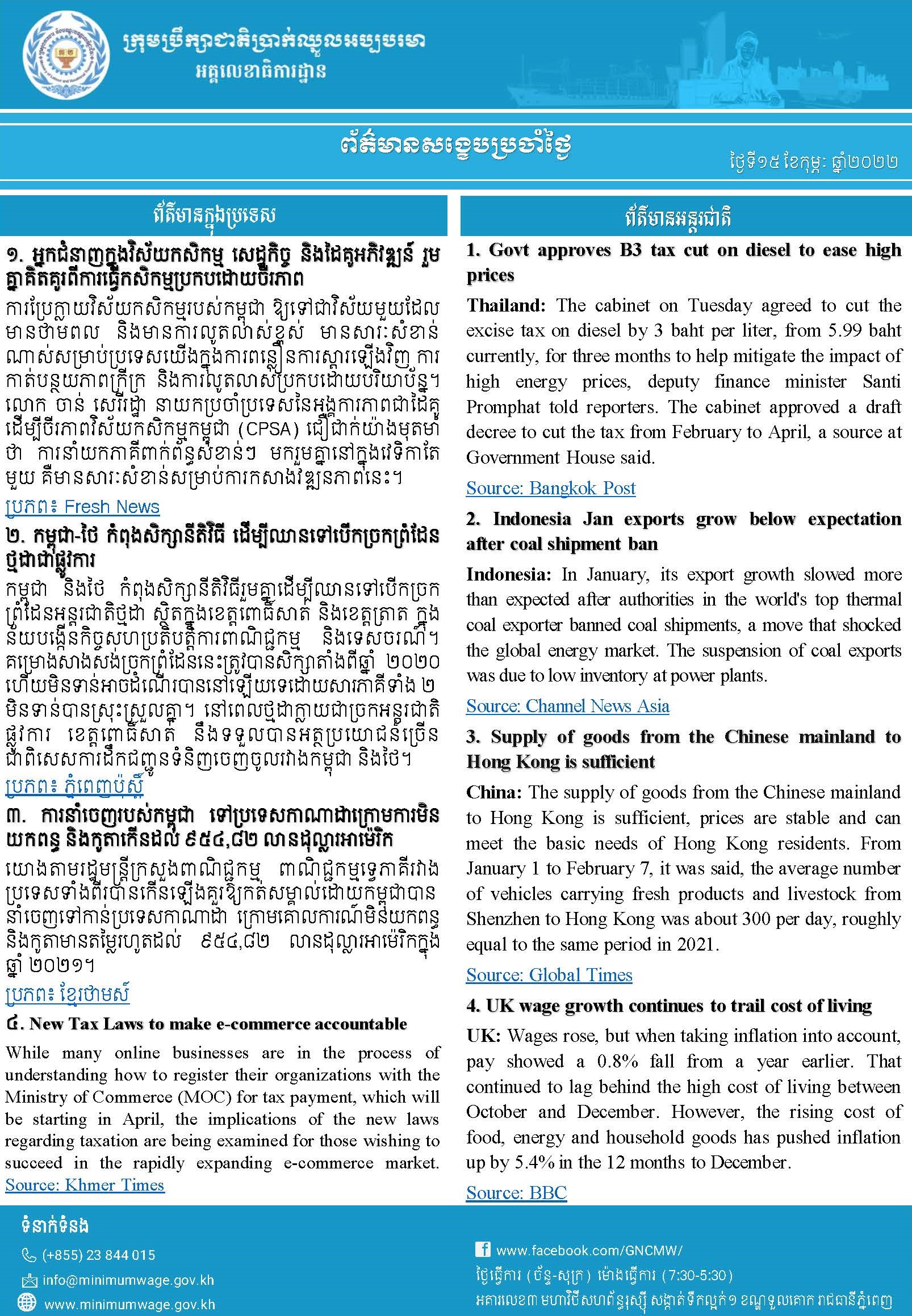 ព័ត៌មានសង្ខេបជាតិ និងអន្តរជាតិប្រចាំថ្ងៃទី១៥ ខែកុម្ភៈ ឆ្នាំ២០២២ ពី អគ្គលេខាធិការដ្ឋានក្រុមប្រឹក្សាជាតិប្រាក់ឈ្នួលអប្បបរមា