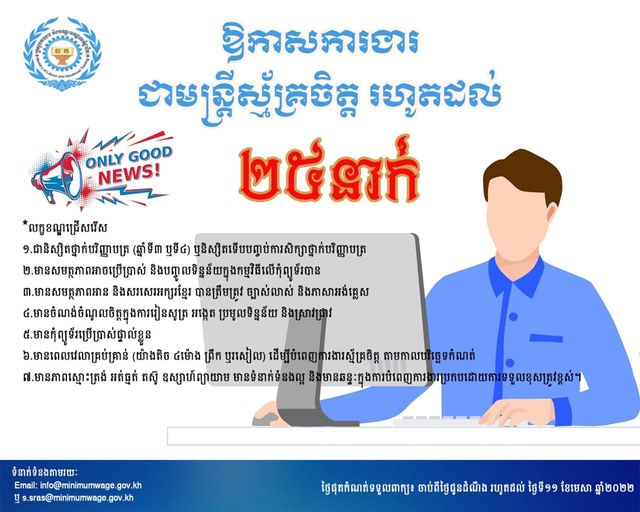 អគ្គលេខាធិការដ្ឋានក្រុមប្រឹក្សាជាតិប្រាក់ឈ្នួលអប្បបរមា នៃក្រសួងការងារ និងបណ្ដុះបណ្ដាលវិជ្ជាជីវៈ សូមជូនដំណឹងដល់សិស្សនិស្សិត និងសាធារណជនទូទៅឱ្យបានជ្រាបថា អគ្គលេខាធិការដ្ឋាន ត្រូវការជ្រើសរើសមន្ត្រីស័្មគ្រចិត្ត ចំនួន ២៥នាក់ អនុវត្តការងារអង្កេត ស្រាវជ្រាវ និងការងារចាំបាច់មួយចំនួនក្នុងអគ្គលេខាធិការដ្ឋានក្រុមប្រឹក្សាជាតិប្រាក់ឈ្នួលអប្បបរមា សម្រាប់រយៈពេល ៤ខែ (ខែមេសា-កក្កដា ឆ្នាំ២០២២)។ បេក្ខជនដែលចាប់អារម្មណ៍អាចផ្ញើ CV មកកាន់សារអេឡិចត្រូនិក របស់អគ្គលេខាធិការដ្ឋាន ដែលមានអាសយដ្ឋាន [email protected] ឬ [email protected] ឬតាមប្រអប់សារបស់ Facebook Page អគ្គលេខាធិការដ្ឋានក្រុមប្រឹក្សាជាតិប្រាក់ឈ្នួលអប្បបរមា។