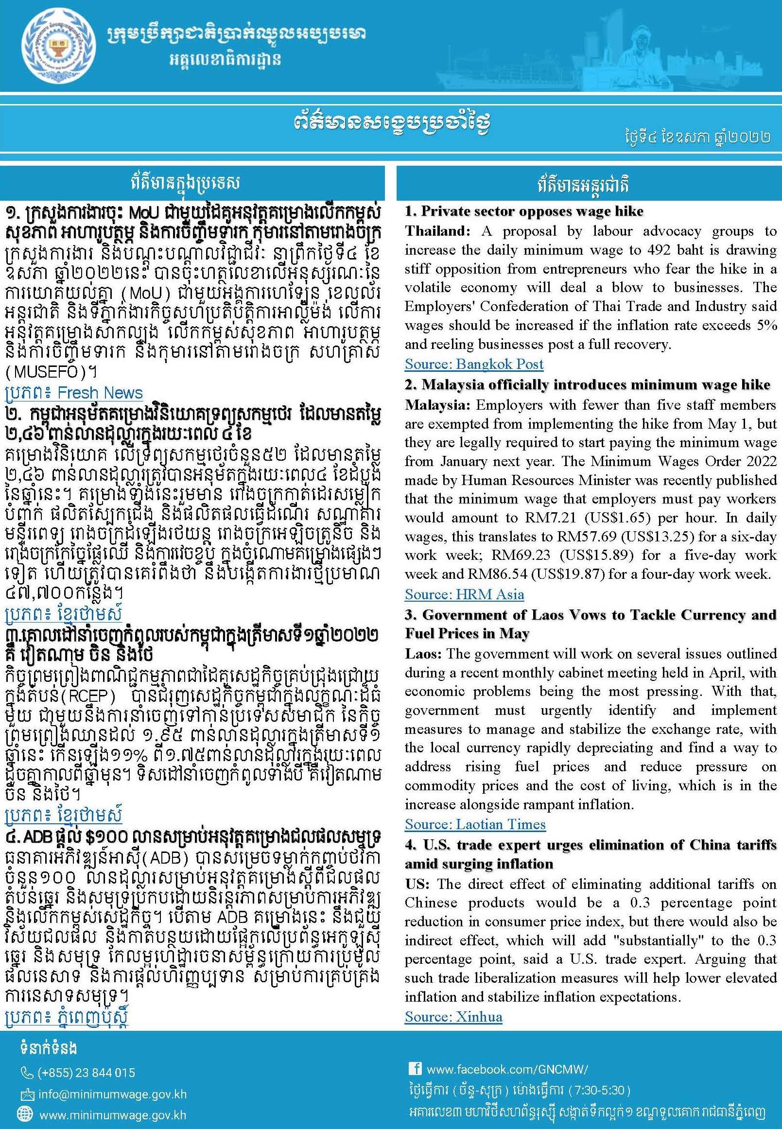 ១. ក្រសួងការងារចុះ MoU ជាមួយដៃគូអនុវត្តគម្រោងលើកកម្ពស់សុខភាព អាហារូបត្ថម្ភ និងការចិញ្ចឹមទារក កុមារនៅតាមរោងចក្រ