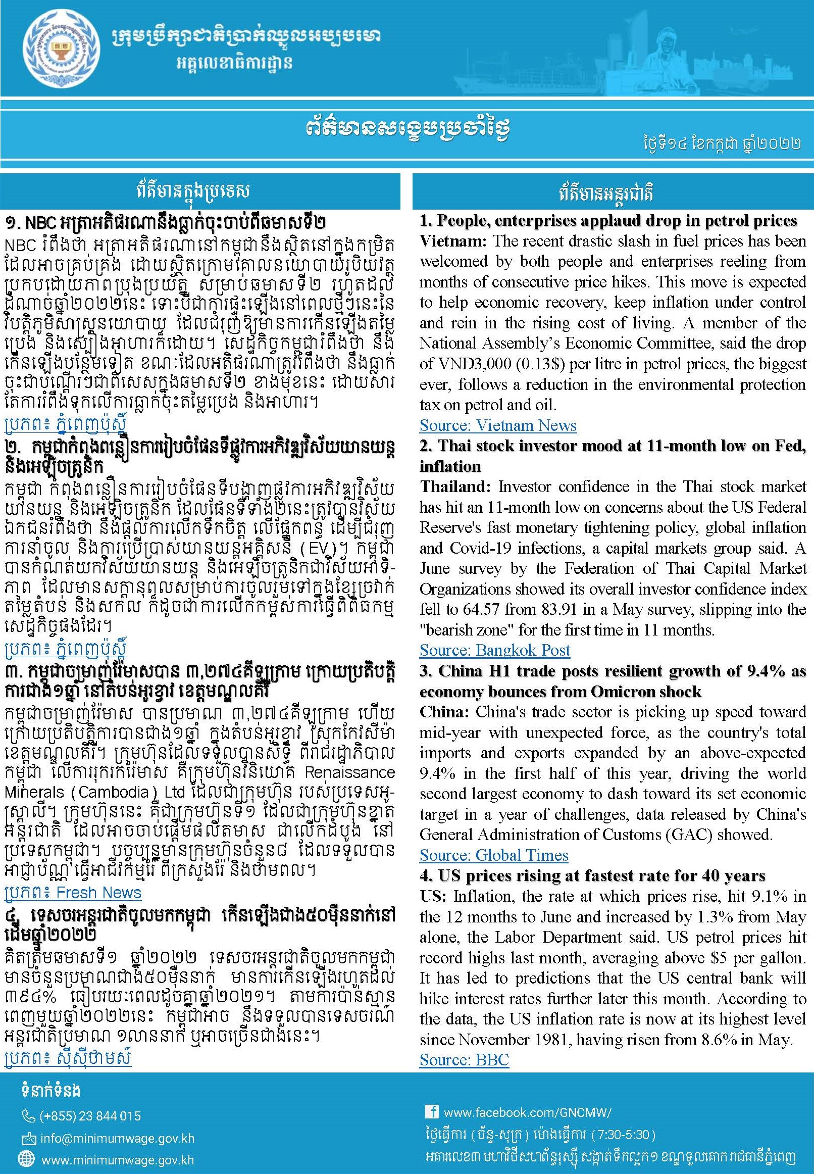 ព័ត៌មានសង្ខេបជាតិ និងអន្តរជាតិប្រចាំថ្ងៃទី១៤ ខែកក្កដា ឆ្នាំ២០២២ ពី អគ្គលេខាធិការដ្ឋានក្រុមប្រឹក្សាជាតិប្រាក់ឈ្នួលអប្បបរមា