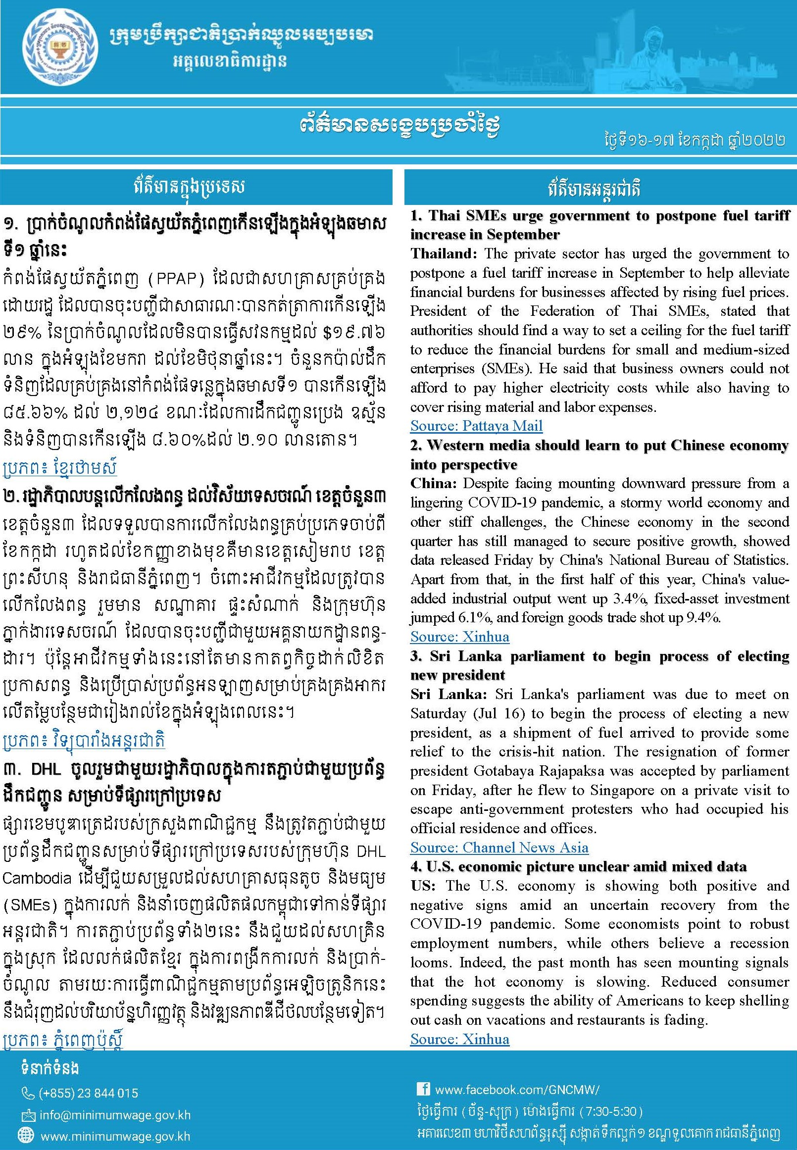 ព័ត៌មានសង្ខេបជាតិ និងអន្តរជាតិប្រចាំថ្ងៃទី១៦-១៧ ខែកក្កដា ឆ្នាំ២០២២ ពី អគ្គលេខាធិការដ្ឋានក្រុមប្រឹក្សាជាតិប្រាក់ឈ្នួលអប្បបរមា
