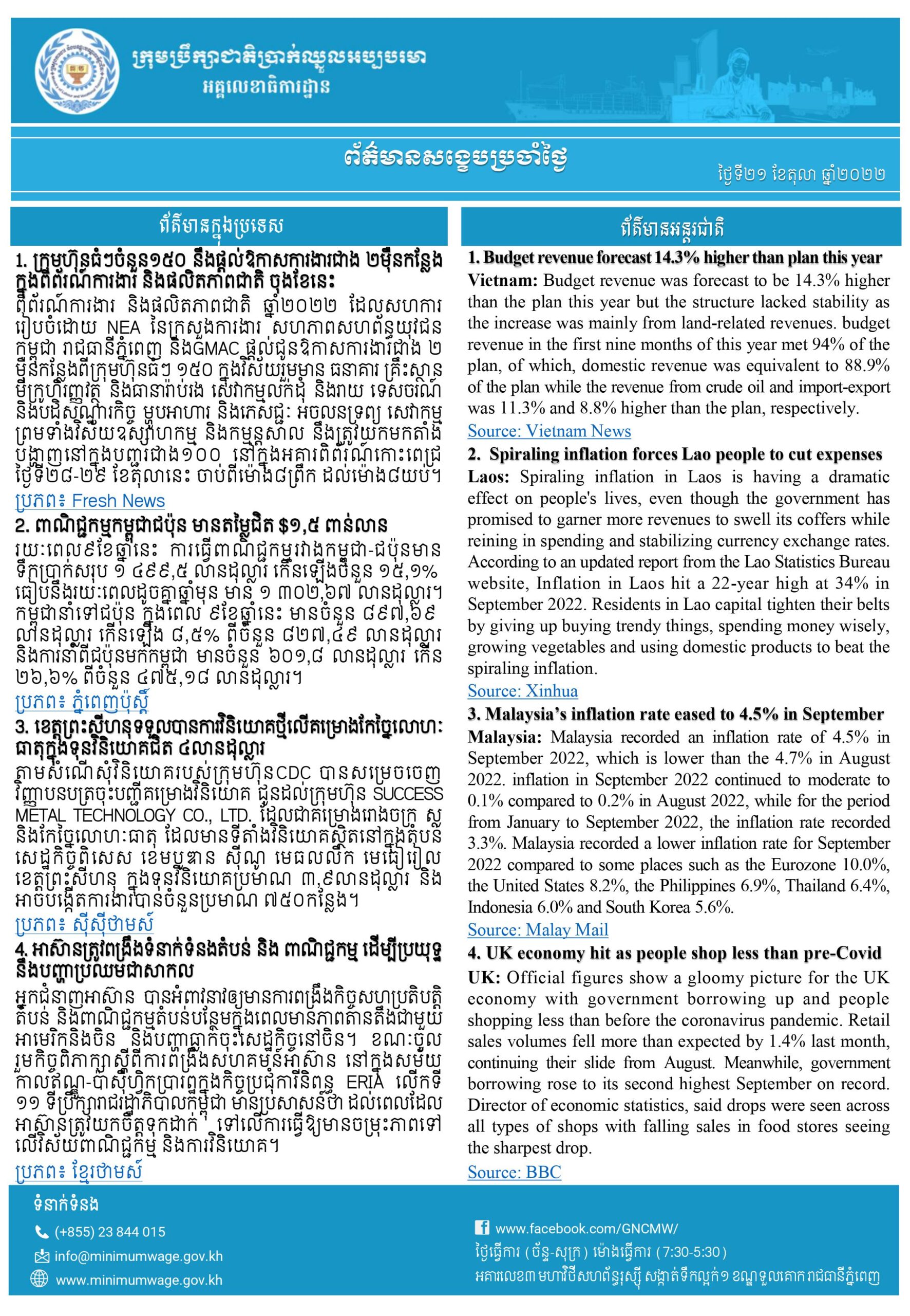 ១. ក្រុមហ៊ុនធំៗចំនួន១៥០ នឹងផ្ដល់ឱកាសការងារជាង ២ម៉ឺនកន្លែង ក្នុងពិព័រណ៍ការងារ និងផលិតភាពជាតិ ចុងខែនេះ