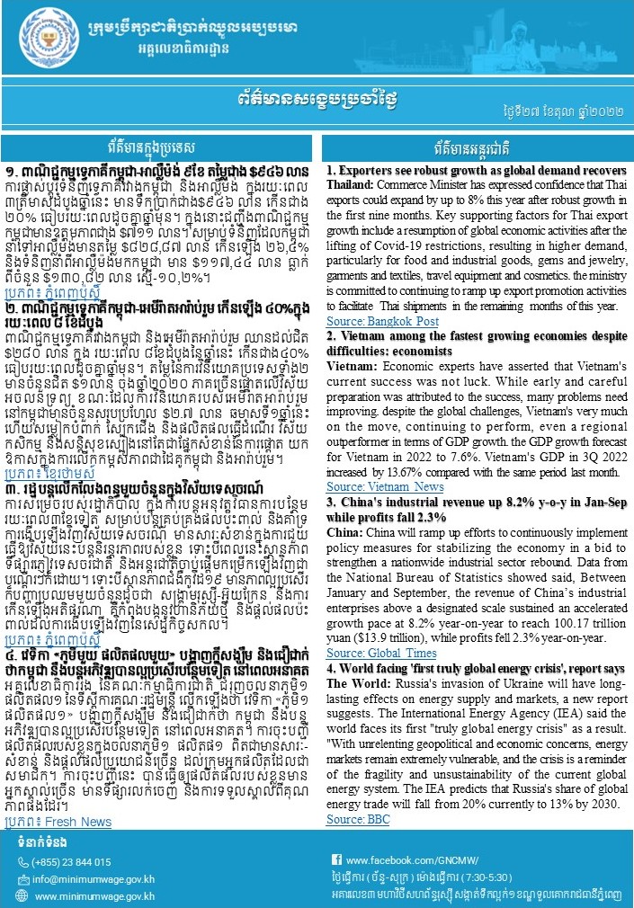 ព័ត៌មានសង្ខេបជាតិ និងអន្តរជាតិប្រចាំថ្ងៃទី២៧ ខែតុលា ឆ្នាំ២០២២ ពី អគ្គលេខាធិការដ្ឋានក្រុមប្រឹក្សាជាតិប្រាក់ឈ្នួលអប្បបរមា