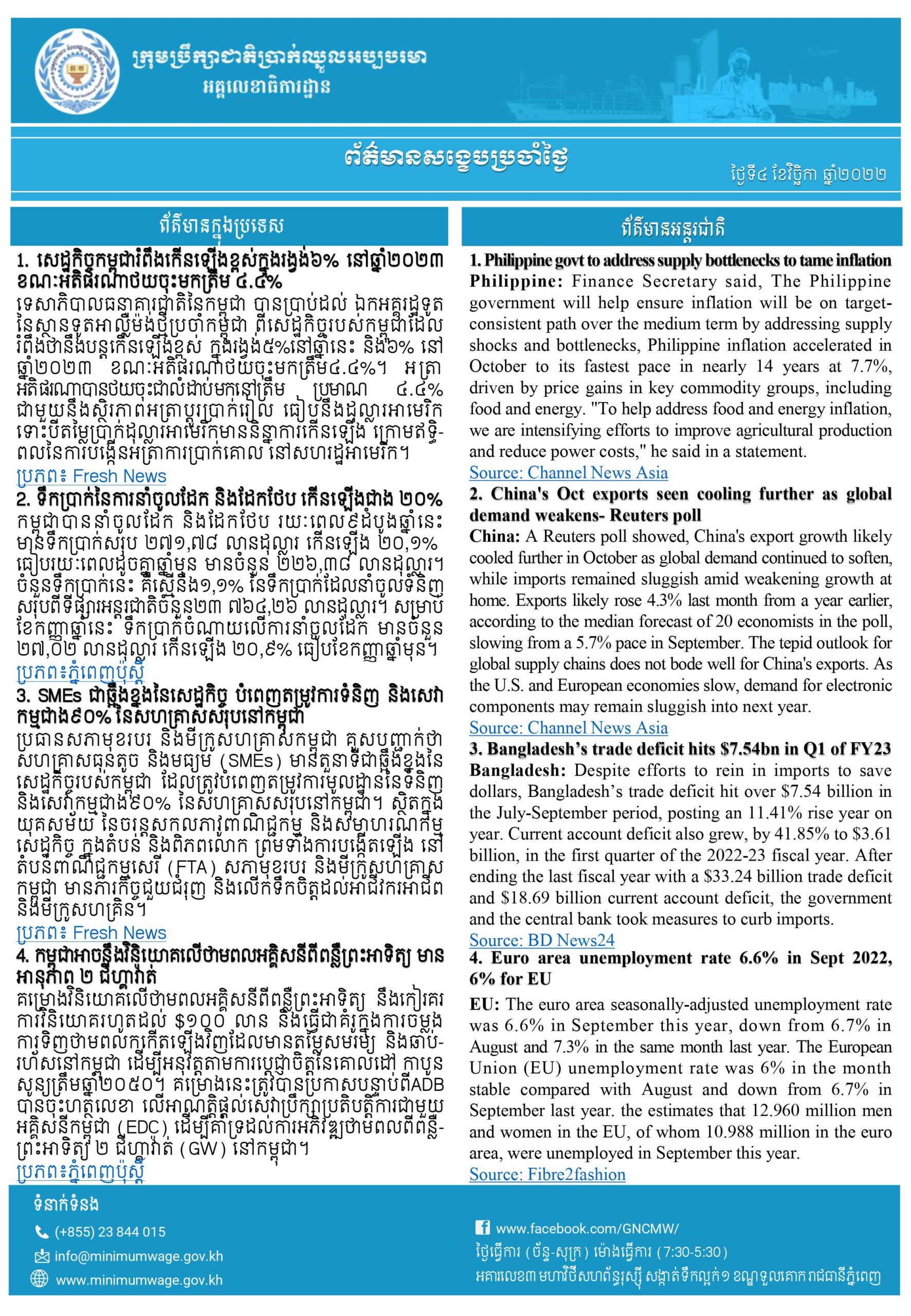 ១. សេដ្ឋកិច្ចកម្ពុជារំពឹងកើនឡើងខ្ពស់ក្នុងរង្វង់៦% នៅឆ្នាំ២០២៣ ខណៈអតិផរណាថយចុះមកត្រឹម ៤.៤%