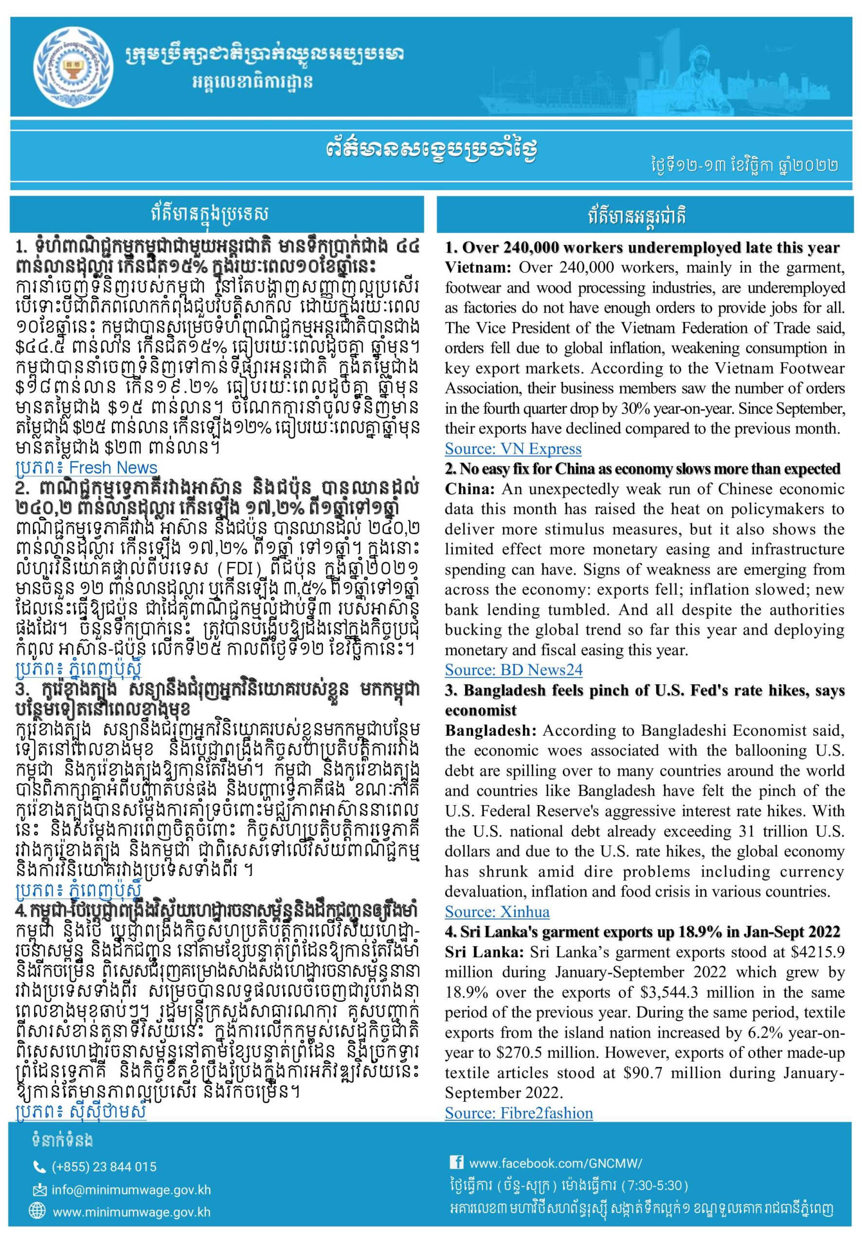 ព័ត៌មានសង្ខេបជាតិ និងអន្តរជាតិប្រចាំថ្ងៃទី១៩ ខែឧសភា ឆ្នាំ២០២២ ពី អគ្គលេខាធិការដ្ឋានក្រុមប្រឹក្សាជាតិប្រាក់ឈ្នួលអប្បបរមា
