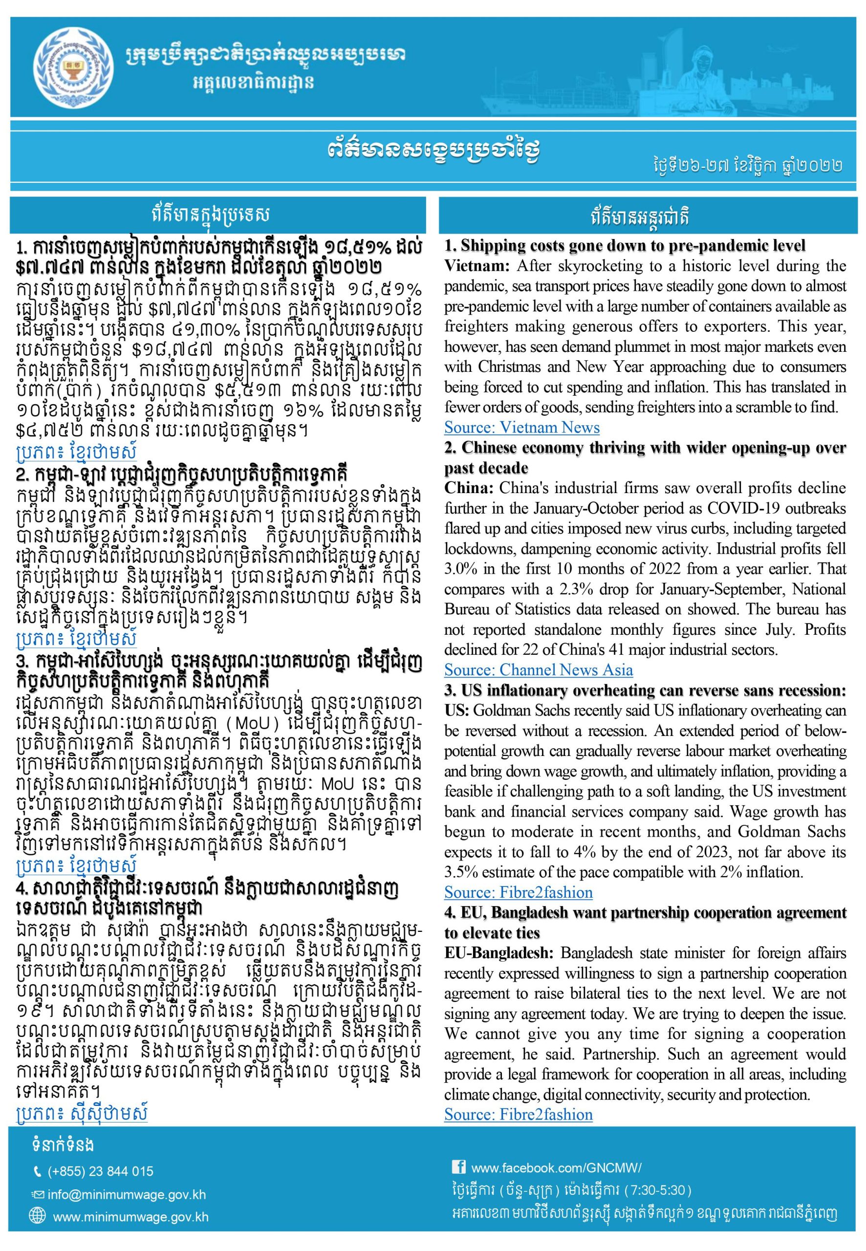 ១. ការនាំចេញសម្លៀកបំពាក់របស់កម្ពុជាកើនឡើង ១៨,៥១% ដល់ $៧.៧៤៧ ពាន់លាន ក្នុងខែមករា ដល់ខែតុលា ឆ្នាំ២០២២
