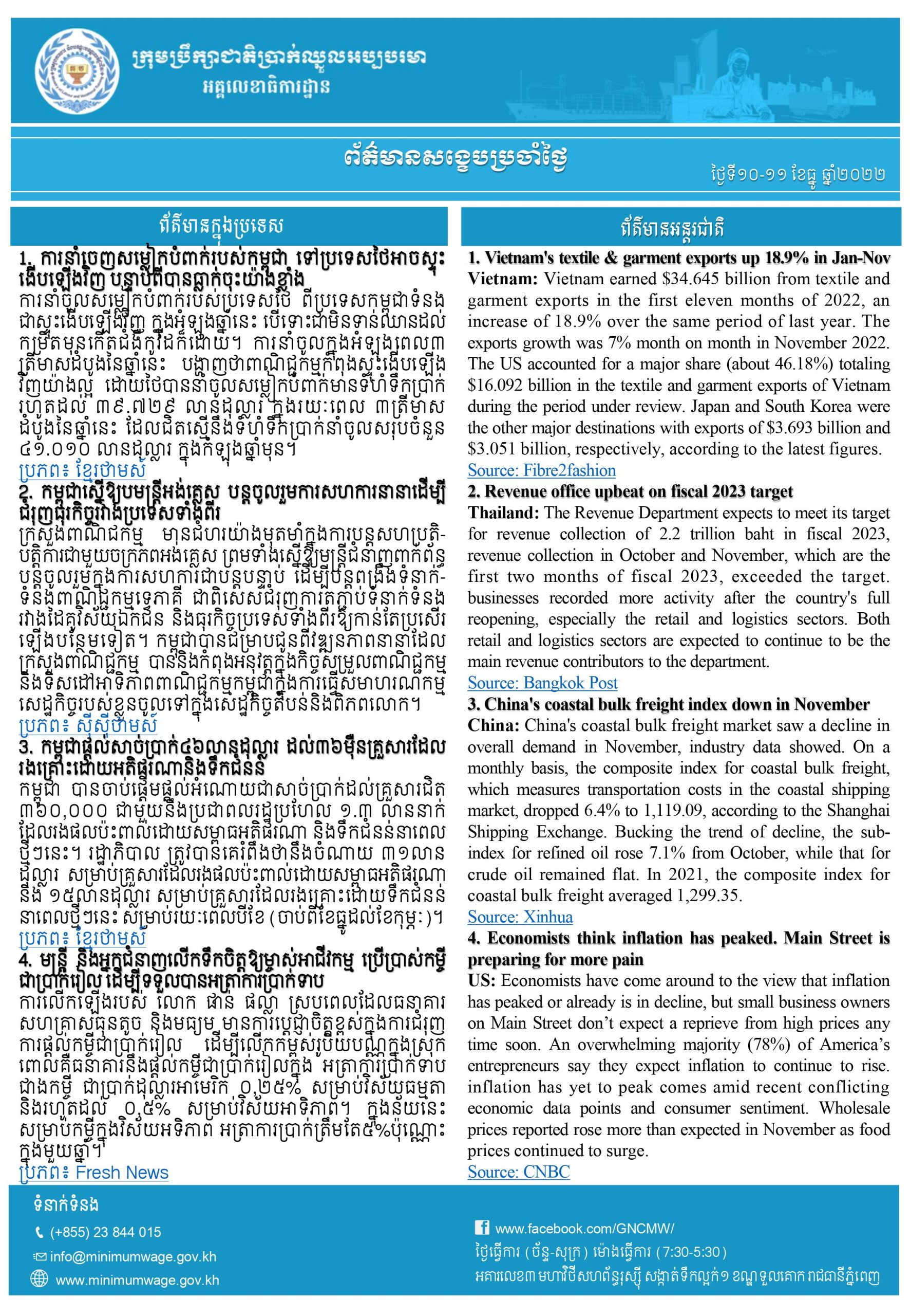 ១. ការនាំចេញសម្លៀកបំពាក់របស់កម្ពុជា ទៅប្រទេសថៃអាចស្ទុះងើបឡើងវិញ បន្ទាប់ពីបានធ្លាក់ចុះយ៉ាងខ្លាំង