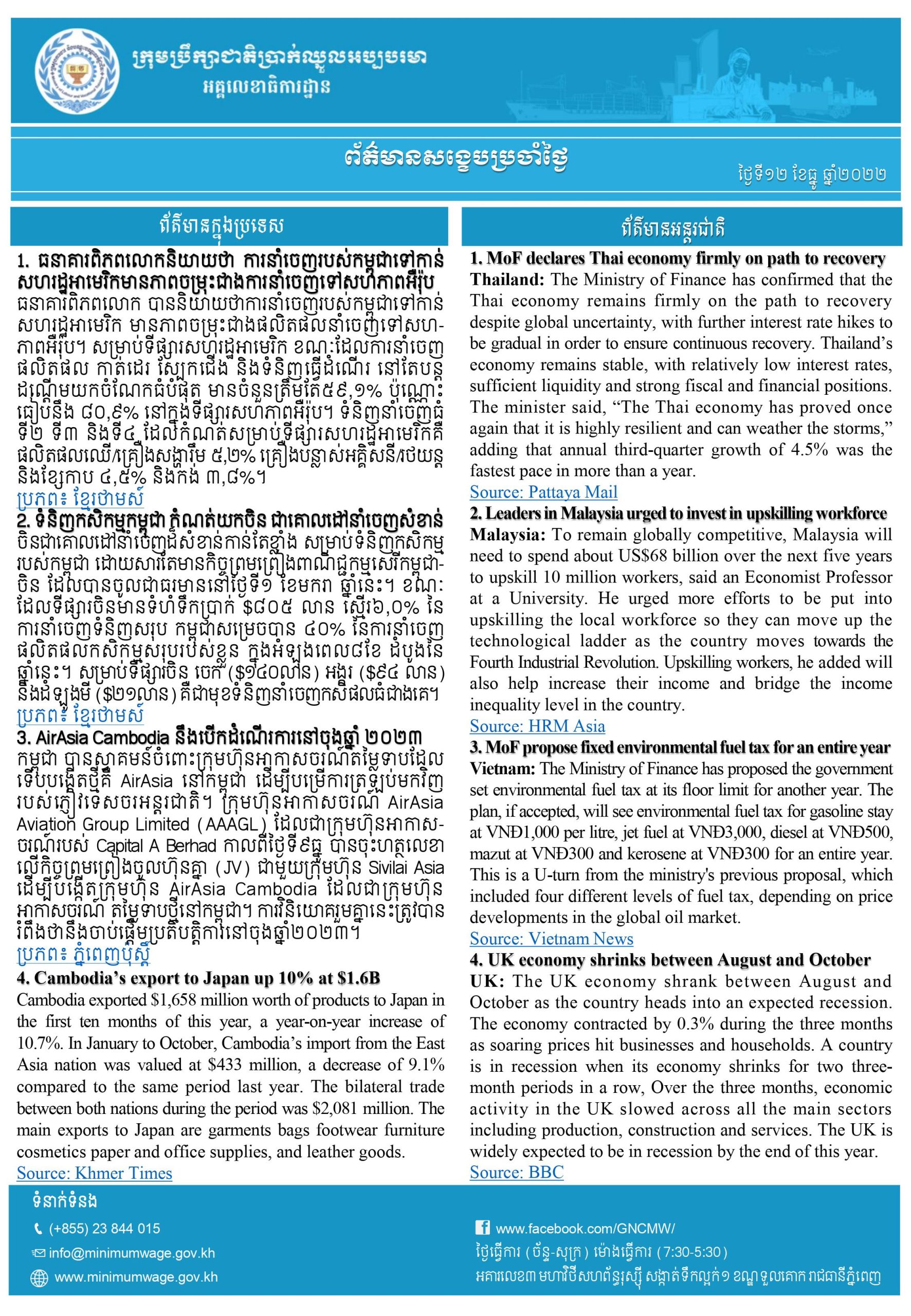 ព័ត៌មានសង្ខេបជាតិ និងអន្តរជាតិប្រចាំថ្ងៃទី១២ ខែធ្នូ ឆ្នាំ២០២២