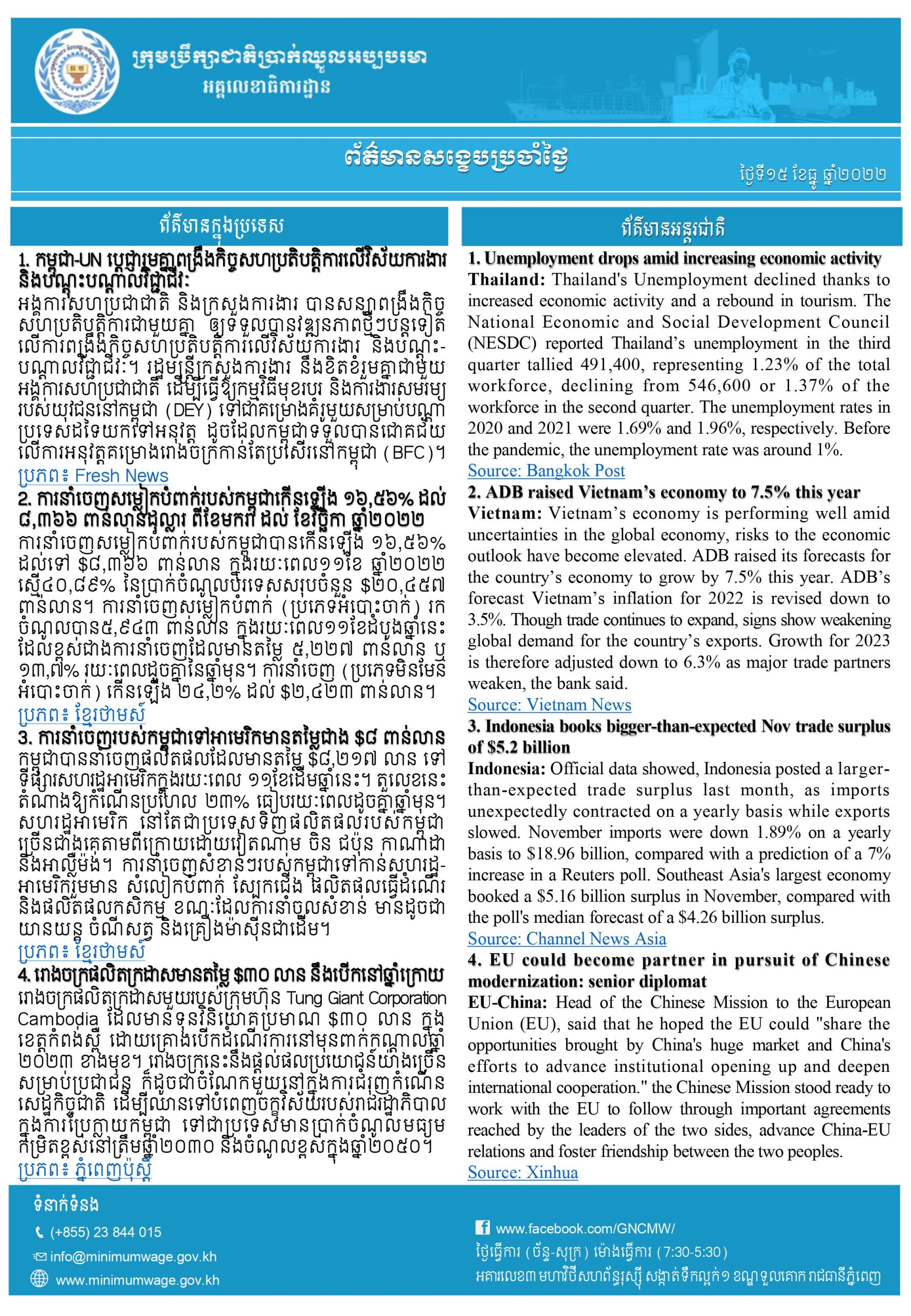 ២. ការនាំចេញសម្លៀកបំពាក់របស់កម្ពុជាកើនឡើង ១៦,៥៦% ដល់ ៨,៣៦៦ ពាន់លានដុល្លារ ពីខែមករា ដល់ ខែវិច្ឆិកា ឆ្នាំ២០២២