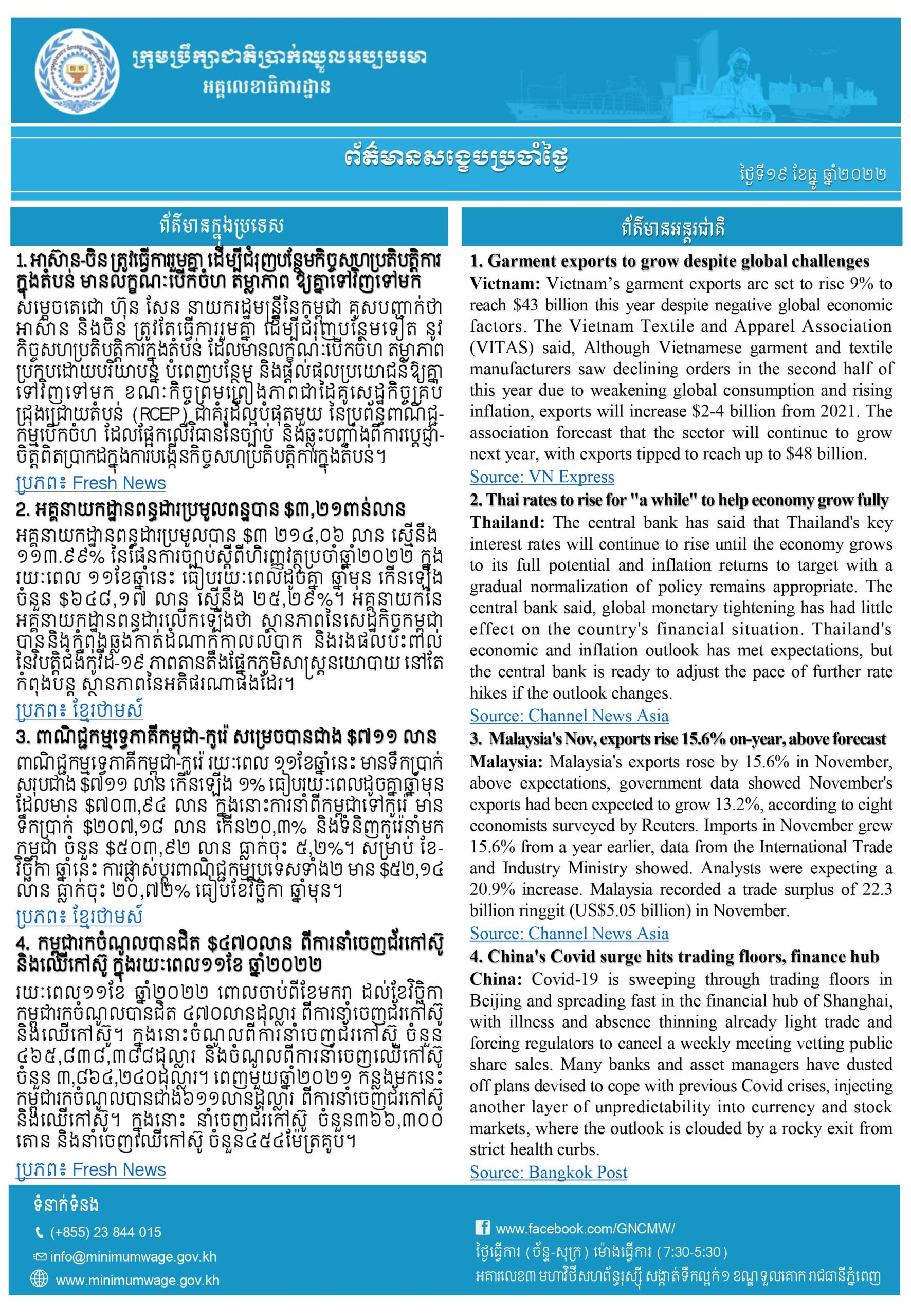 ព័ត៌មានសង្ខេបជាតិ និងអន្តរជាតិប្រចាំថ្ងៃទី១៥ ខែកក្កដា ឆ្នាំ២០២២ ពី អគ្គលេខាធិការដ្ឋានក្រុមប្រឹក្សាជាតិប្រាក់ឈ្នួលអប្បបរមា