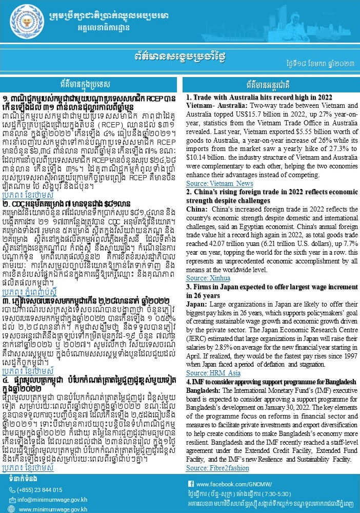 ព័ត៌មានសង្ខេបជាតិ និងអន្តរជាតិប្រចាំថ្ងៃទី១៨ ខែមករា ឆ្នាំ២០២៣ ពី អគ្គលេខាធិការដ្ឋានក្រុមប្រឹក្សាជាតិប្រាក់ឈ្នួលអប្បបរមា