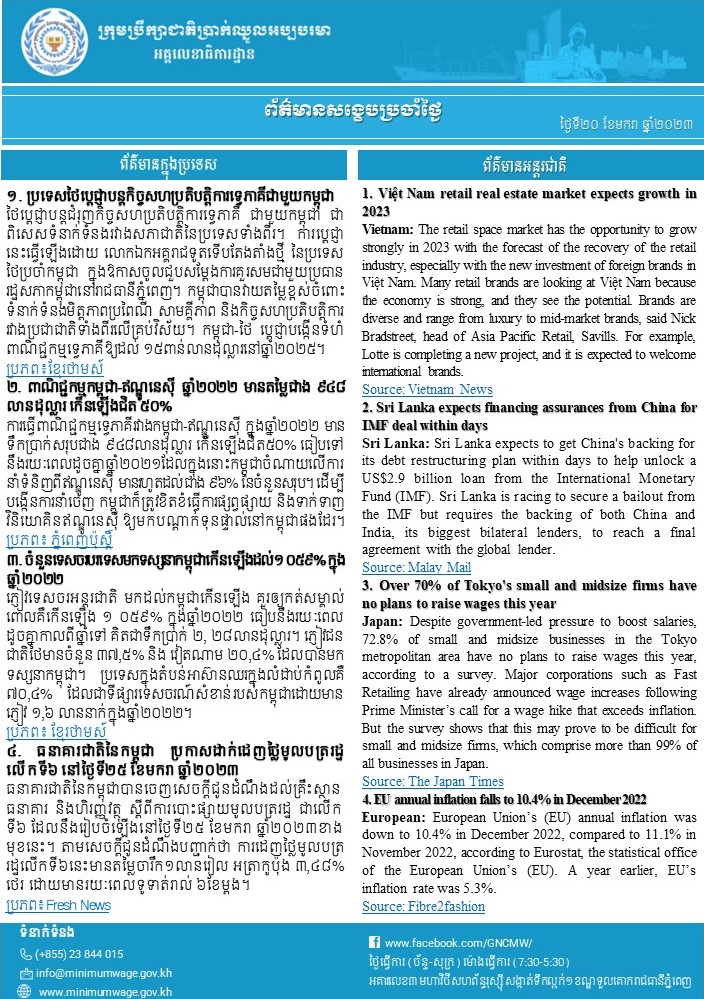 ៤. ធនាគារជាតិនៃកម្ពុជា ប្រកាសដាក់ដេញថ្លៃមូលបត្ររដ្ឋ លើកទី៦ នៅថ្ងៃទី២៥ ខែមករា ឆ្នាំ២០២៣